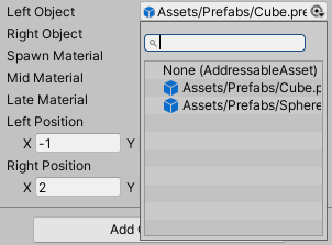 하지만, 이렇게 모든 타입의 에셋 리스트가 표시되면 실수를 할 수 있게 됩니다. 예를 들면 스프라이트만 참조해야 하는데 클릭미스로 게임 오브젝트를 참조시킨다는 등의 실수 말이죠. 이런 실수를 방지하기 위해 AssetReferenceGameObject, AssetReferenceSprite, AssetReferenceTexture 등이 존재하지만 이 리스트에 없는 Material 등 특정 타입은 어떻게 해야 하는지 알아보겠습니다.