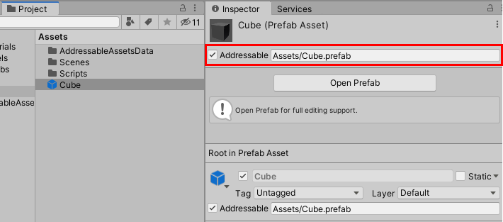 위에서 만든 프리팹들의 Inspector창에서 Addressable을 활성화합니다.