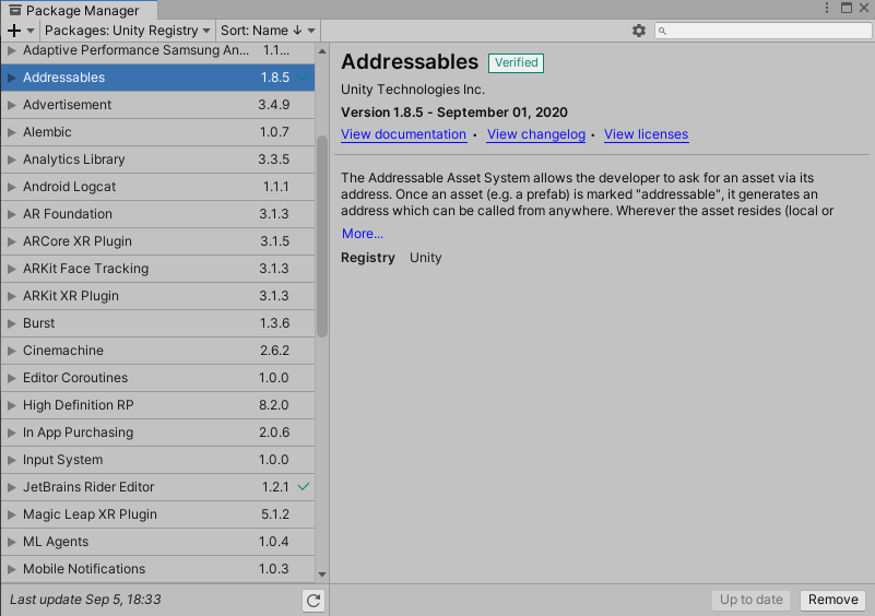 Addressable은 2020.1 버전 기준으로 정식 버전이 되었습니다. Package Manager 에서 Addressable을 Install 해주세요.