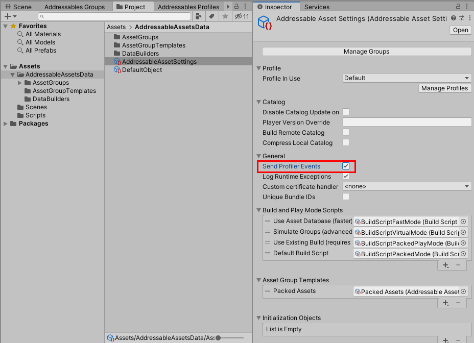 AddressableAssetSettings 에서 Send Profiler Events 를 활성화하면 Addressable Event Viewer 를 통해 Addressable 프로파일러를 확인 할 수 있게 됩니다.