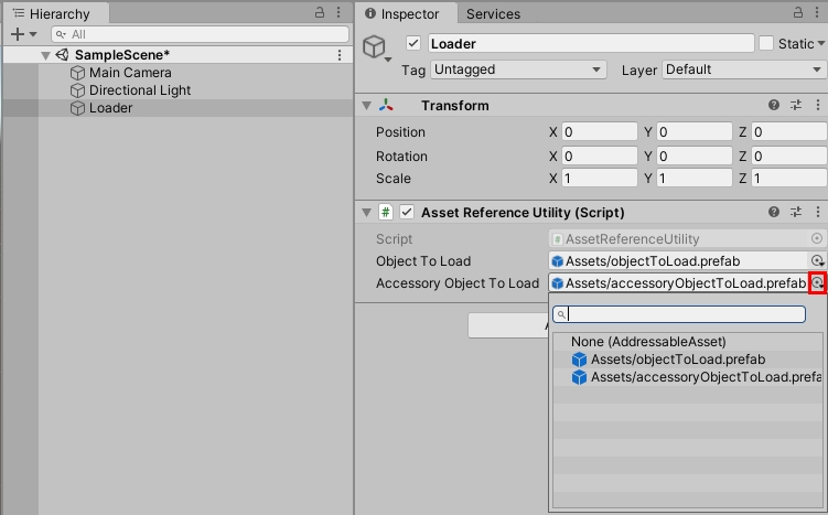 하이러키 창의 Loader에 위에서 만든 스크립트를 연결하고 AssetsReference 변수들을 참조시킵니다. 우측 끝에 드롭 다운 버튼을 누르면 연결할 수 있는 에셋 리스트가 나옵니다.