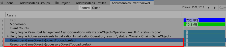 재생 버튼을 눌러 확인합니다. 두 개의 리소스가 올라간 것을 확인 할 수 있습니다. Addressable Event Viewer에 대해서는 차후 상세하게 설명할 예정입니다. 지금은 여기서 메모리에 올라간 리소스를 확인할 수 있다는 것을 아시면 됩니다.