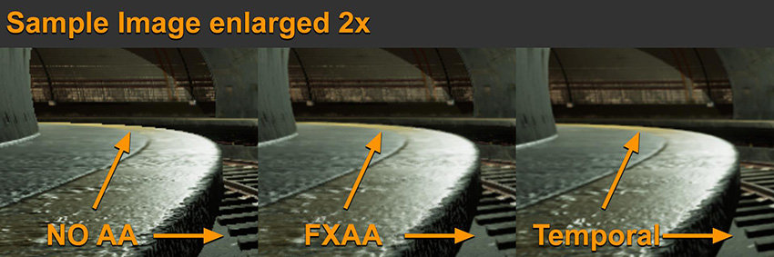 3D 폴리곤을 해상도가 낮은 2D 화면으로 래스터화하는 경우 최종 픽셀에 계단 모양 같은 앨리어싱 효과가 나타납니다(오브젝트 가장자리에 표시되는 계단 모양 같은 결과물). 실시간 3D에 슈퍼샘플링, 멀티샘플 안티앨리어싱(MSAA), 고속 근사 안티앨리어싱(FXAA), 공간 안티앨리어싱(SMAA) 및 시간적 안티앨리어싱(TXAA) 같은 안티앨리어싱 기법을 사용하는 몇 가지 솔루션이 있습니다. 이 중에서 효과와 성능이 가장 높은 FXAA와 TXAA 기법이 현재 가장 많이 사용됩니다. FXAA와 TXAA를 비교한 샘플 씬을 아래에서 확인해 보겠습니다.