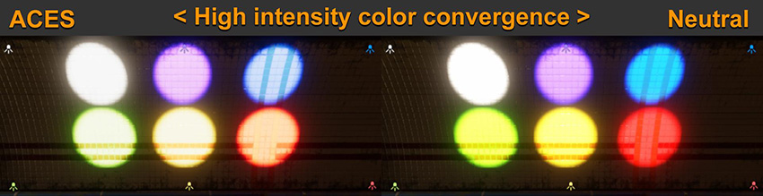 고려해야 하는 중요한 차이점은 두 가지 톤 매퍼가 컬러 광원 같은 고강도 컬러 값이나 폭발 효과 또는 불꽃의 발광 효과를 처리하는 방법입니다. 아래 그림에서는 ACES 톤 매퍼가 어떻게 고강도 컬러를 중립(Neutral) 톤 매퍼와 다르게 정규화하는지 확인할 수 있습니다.