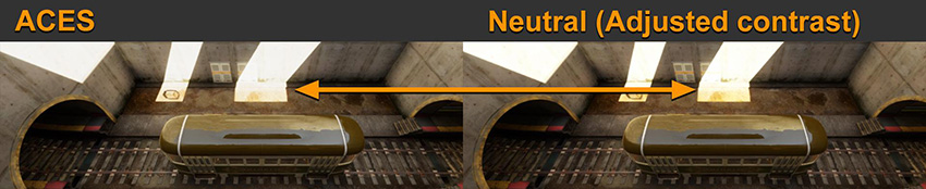 입력 데이터의 리니어 HDR 버퍼를 처리하고 지정된 색 공간에 다시 렌더링하여 최종 출력하는 톤 매퍼를 사용해 고강도 컬러 값을 처리할 수 있습니다. 이 과정은 카메라가 작동하는 방법과 유시합니다. Unity 포스트 프로세싱에는 중립(Neutral) 과 ACES(Academy Color Encoding System(Wikipedia))라는 두 가지 타입의 톤 매퍼가 있습니다. 처음 보면 두 가지 톤 매퍼의 기본 콘트라스트가 다르다는 것이 눈에 띕니다. 하지만 둘의 주된 차이점은 중립(Neutral) 을 ACES 와 콘트라스트가 비슷해지도록 조정할 수 있다는 것입니다. 아래 그림에서 두 샘플은 거의 동일합니다. 여기서 중립(Neutral) 설정은 블랙 인(Black In) 0.02, 화이트 인(White In) 10, 블랙 아웃(Black Out) –0.04, 화이트 아웃(White Out) 10, 화이트 레벨(White Level) 5.3, 화이트 클립(White Clip) 10입니다.