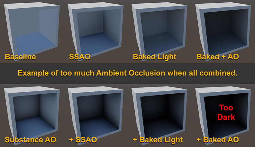 일반적으로 SSAO는 씬의 앰비언트 셰이딩에 유용한 반면, 과도한 오클루전을 초래할 수 있습니다. 오프라인 3D 모델링 애플리케이션에서 오브젝트별로 베이크된 앰비언트 오클루전을 광원 베이킹의 추가 앰비언트 오클루전과 함께 사용하면 SSAO가 앰비언트 오클루전의 세 번째 레이어가 됩니다.